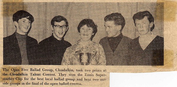 From then on we were children of the ‘60’s, all singing and playing. In our home village of Clondalkin our folk group “The Roving Kind” , AKA "Opus 5", won the local talent show 3 times and played in other venues such as the famous “Embankment”, Mick McCarthy’s venue in Tallaght, as well as in the Dublin folkclubs of the time such as the "Coffee Kitchen".